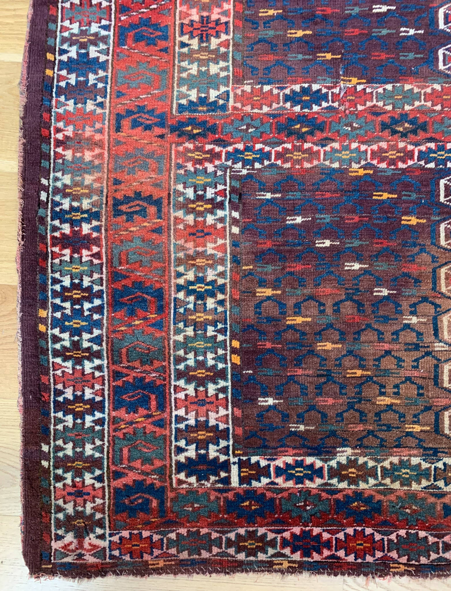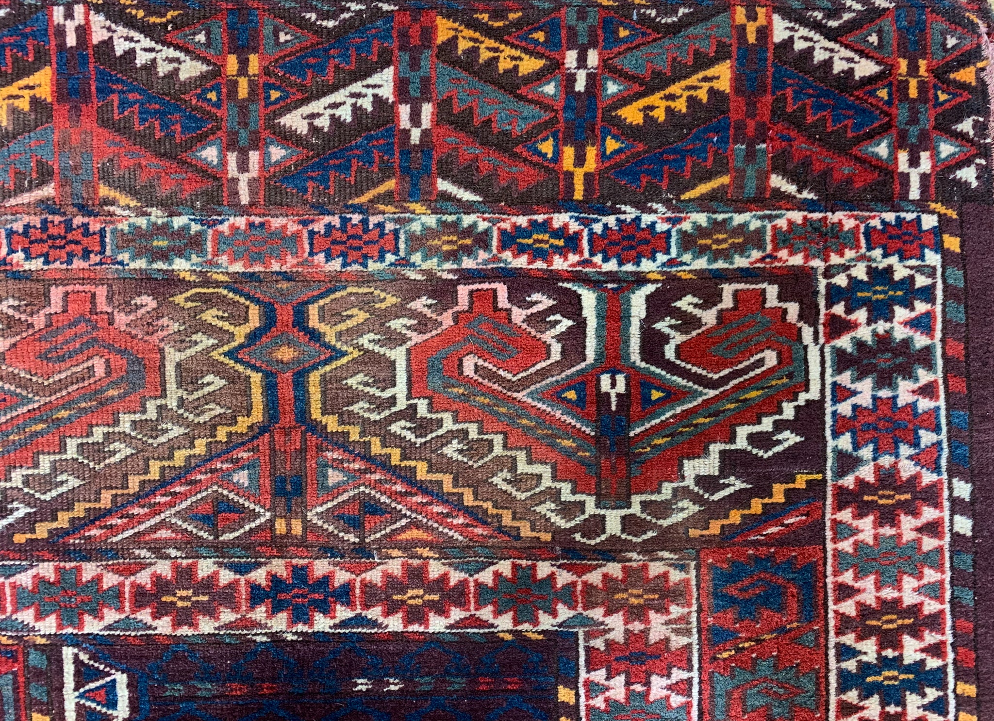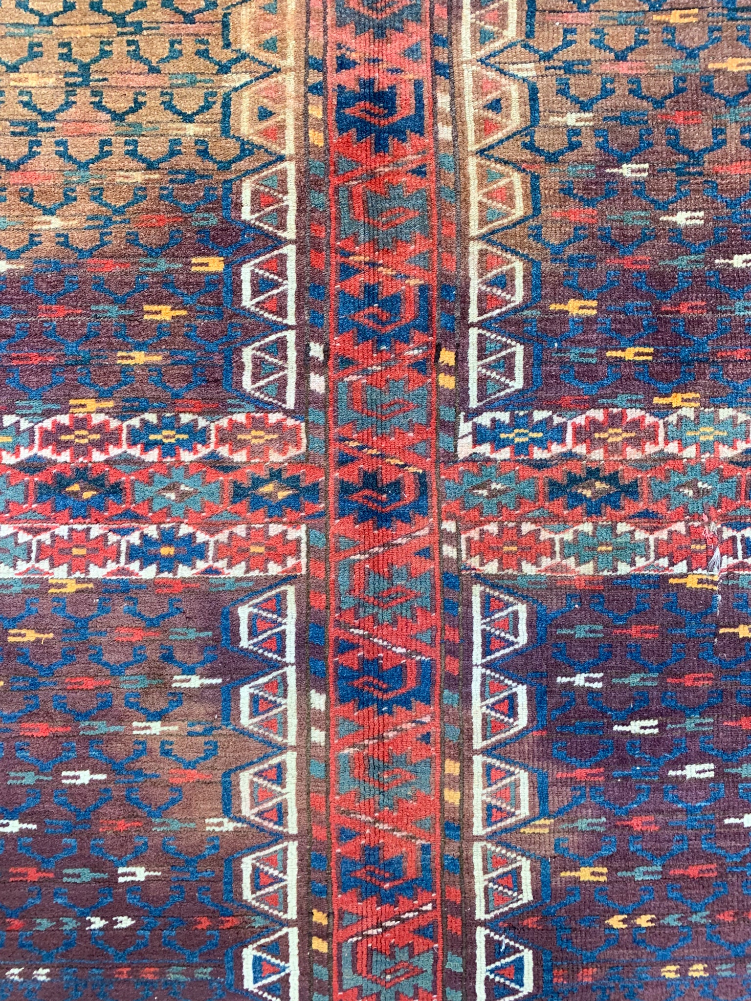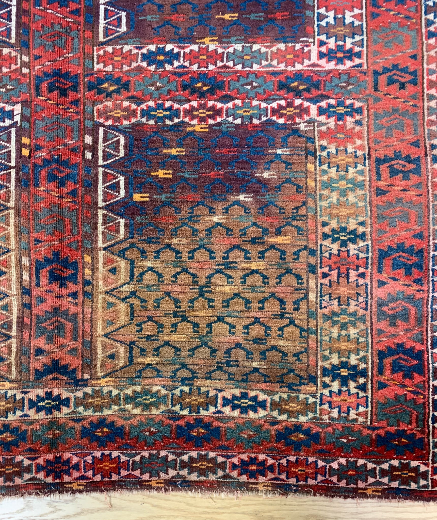 A charming and vibrant colour scheme with the quadrants containing geometric motifs in red, green, yellow, blue and cream set on a ground that ranges from a dark maroon to tan.