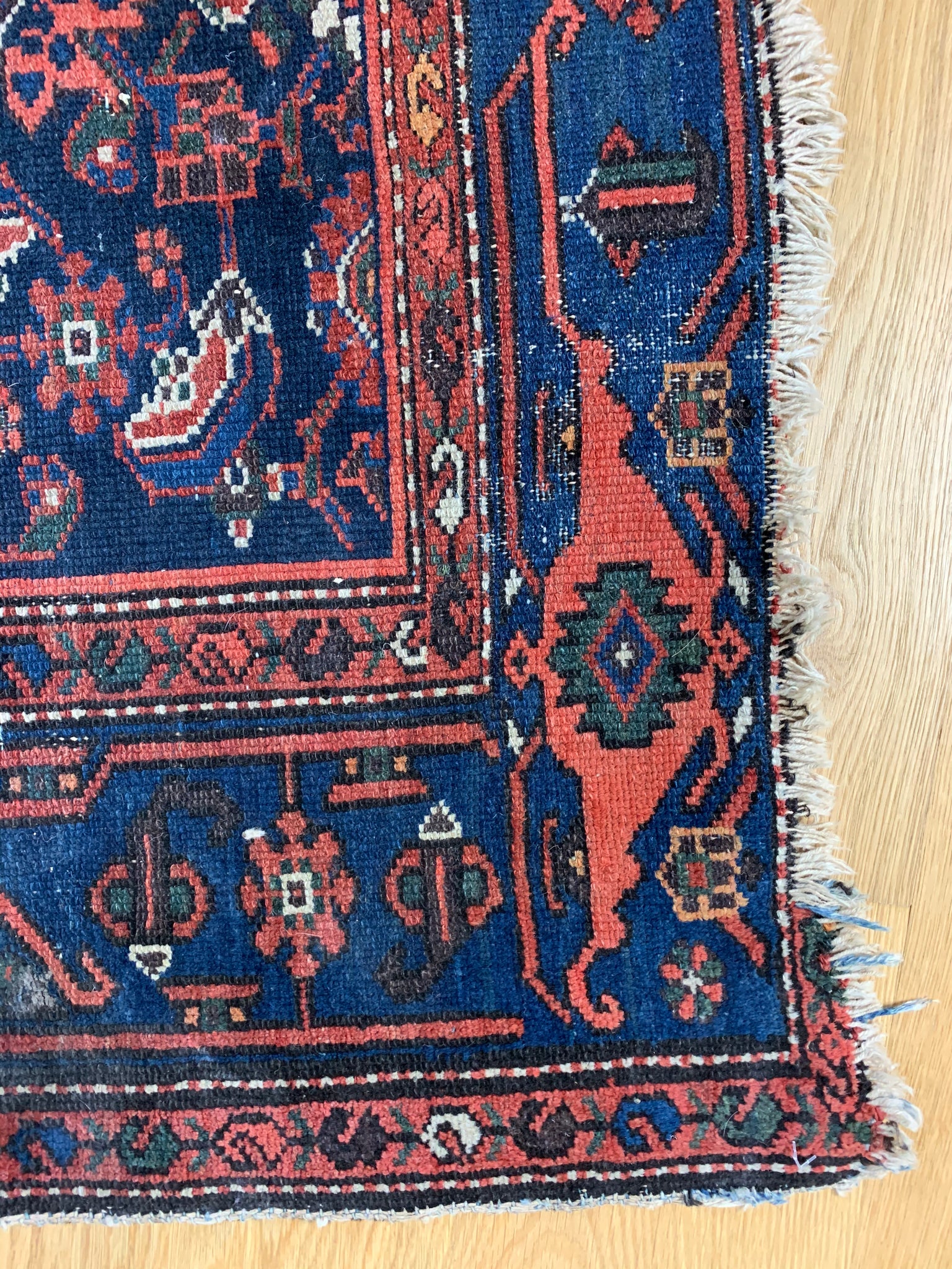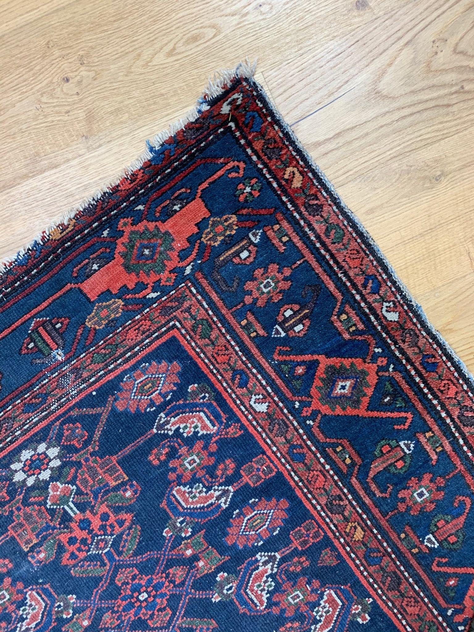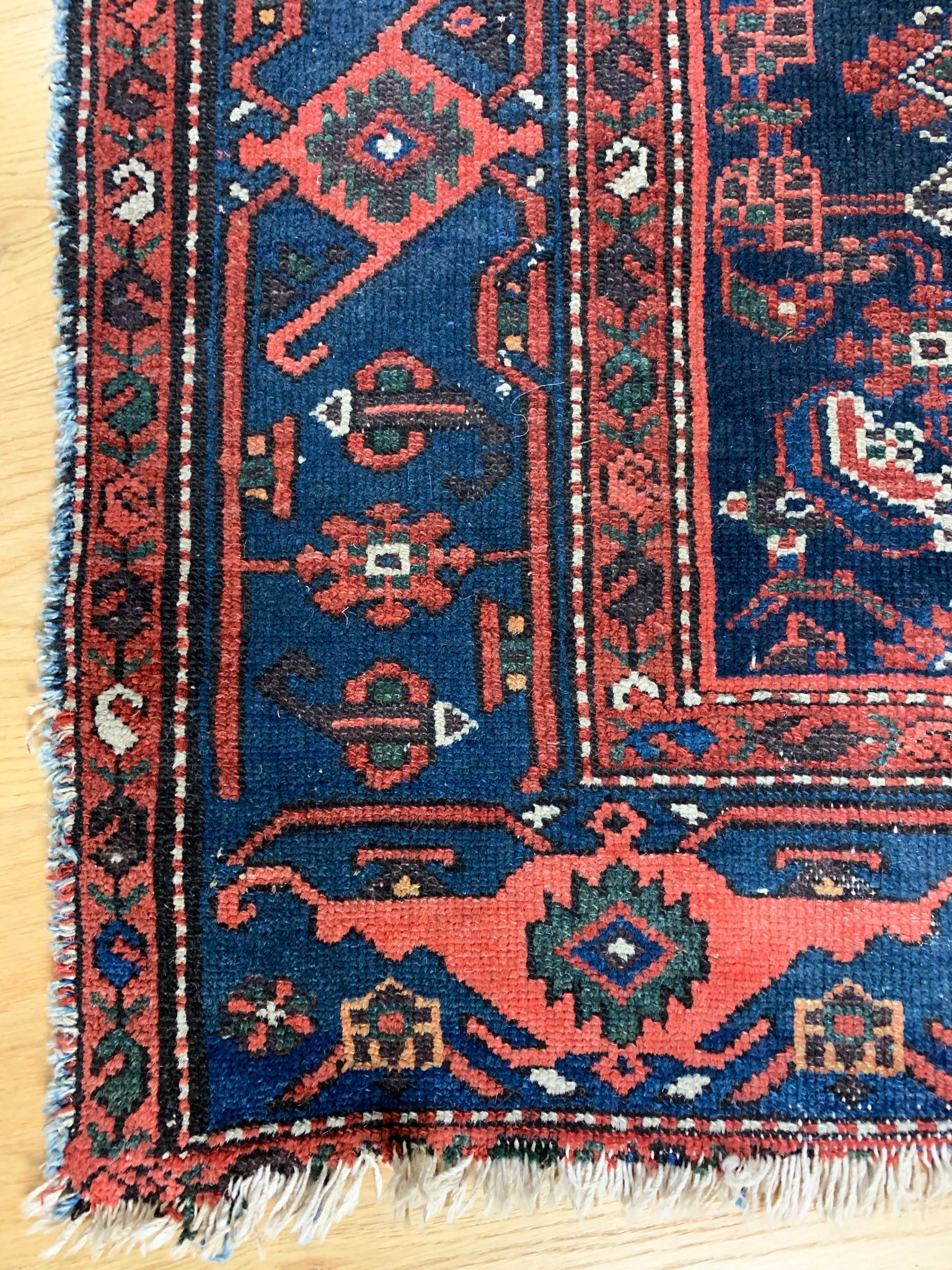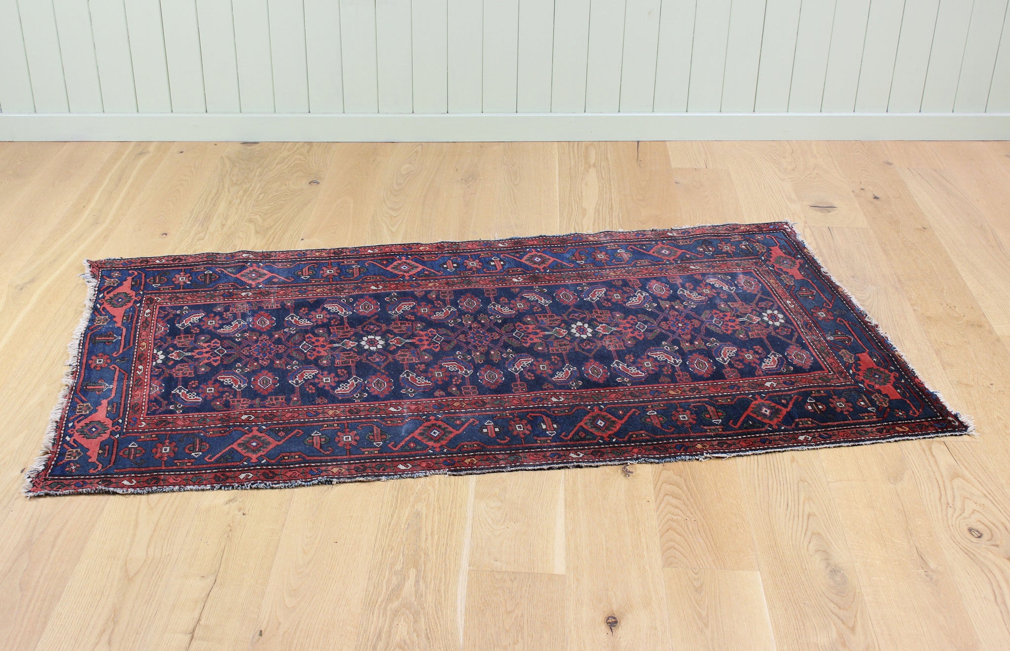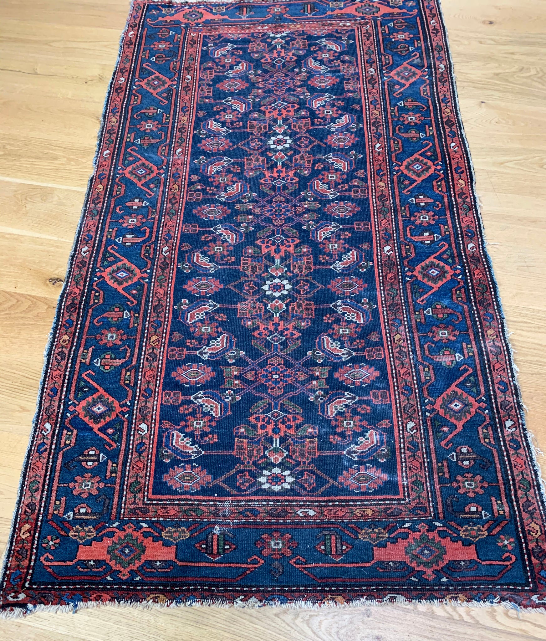 An early 20th century Hamadan rug, with a repeating floral design on a blue ground and intricately patterned borders.