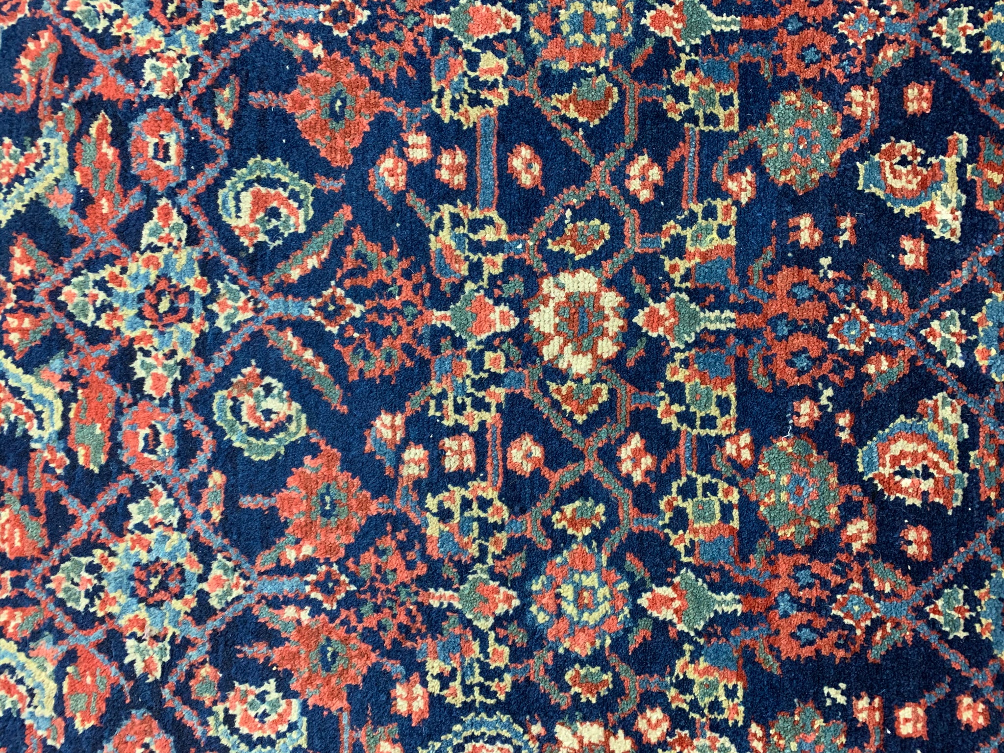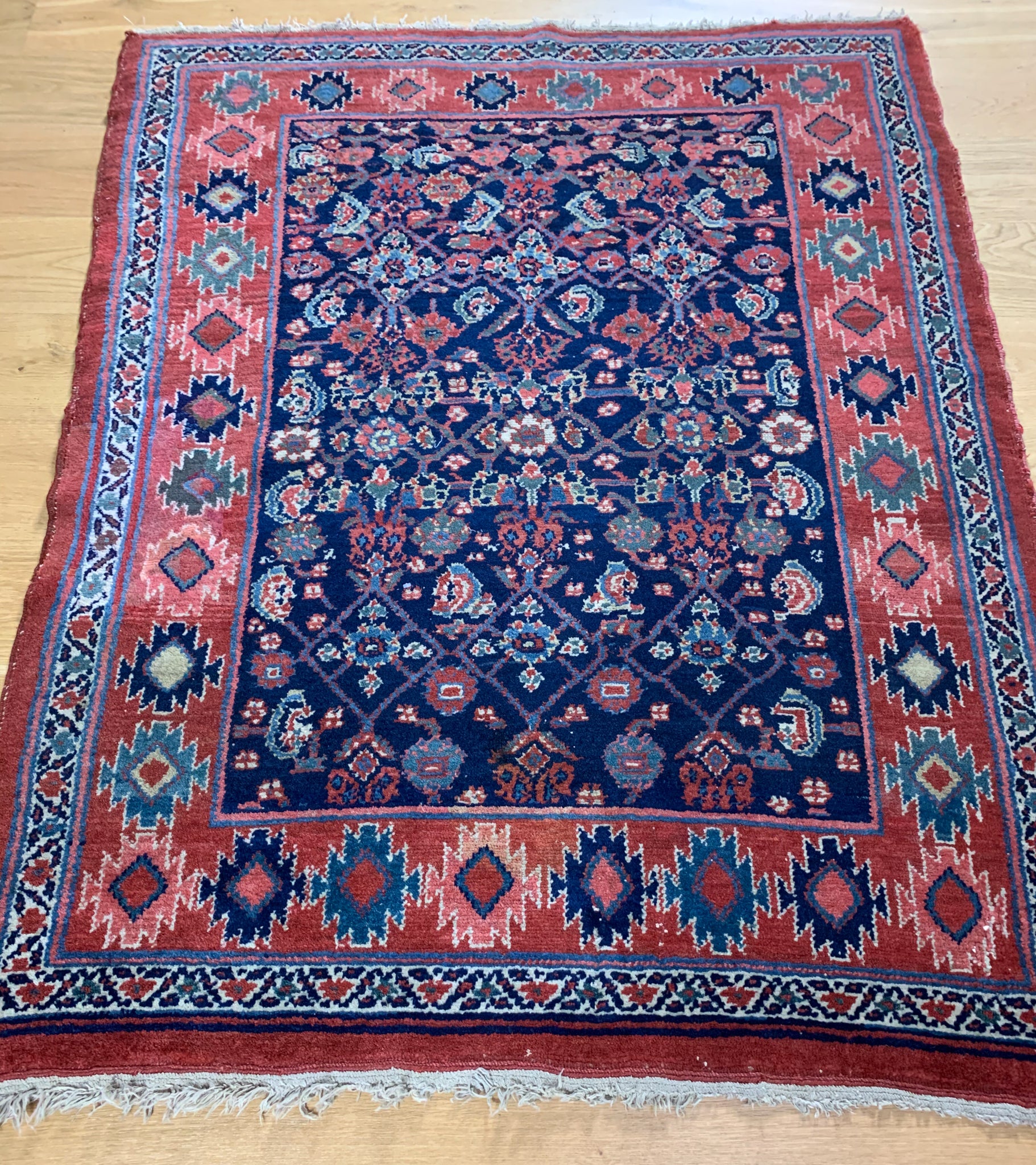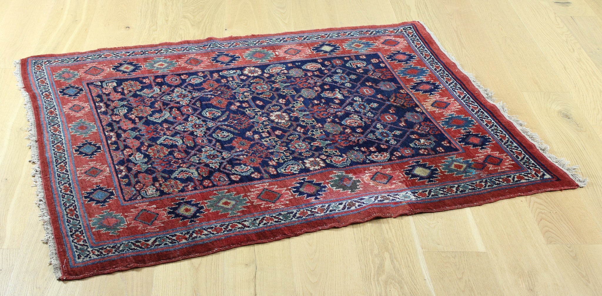 Herati patterns on the dark blue ground are surrounded by borders with hooked motifs. The colours include green, grey-green, pink, blue, red and a very pale yellow.