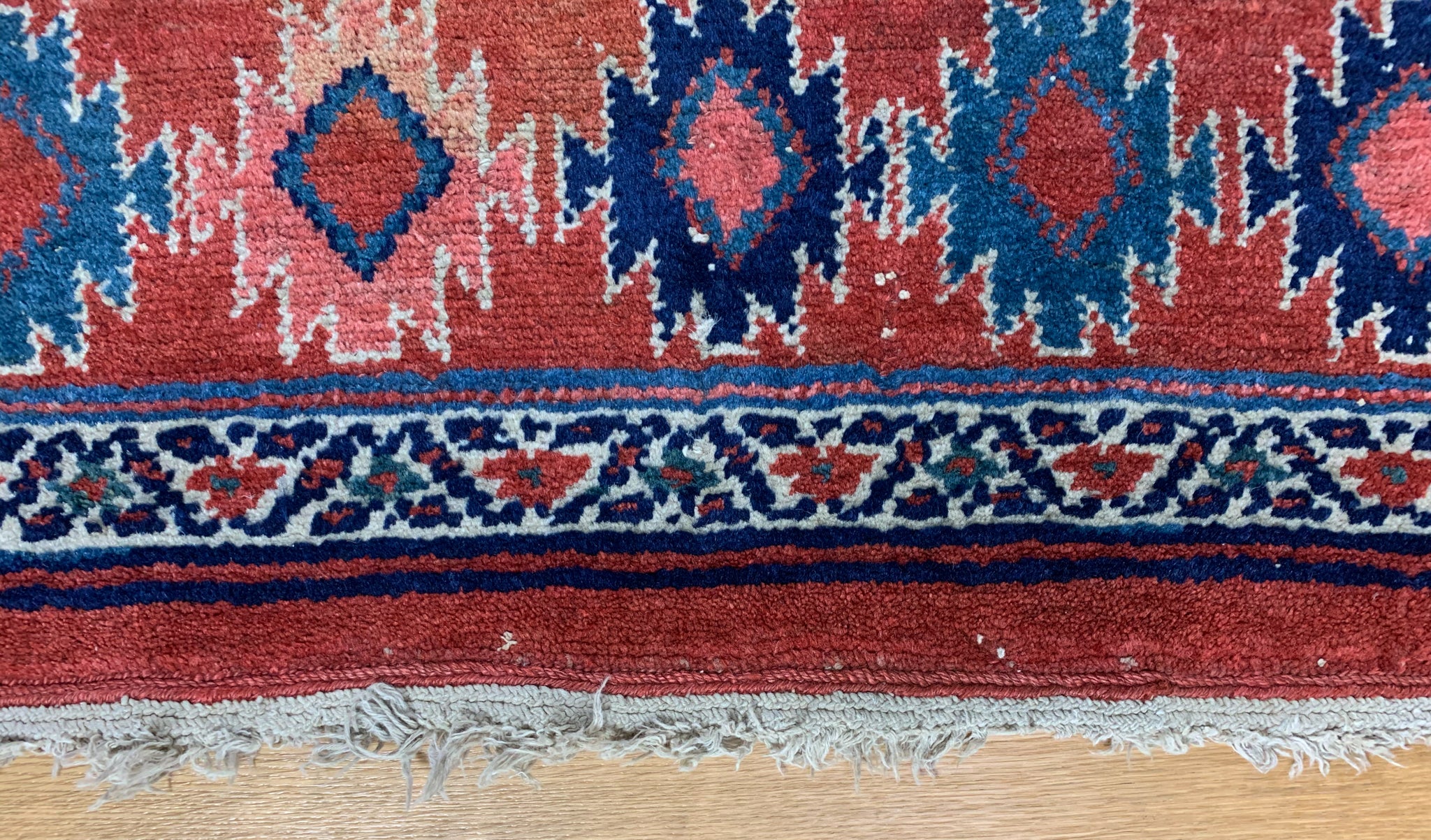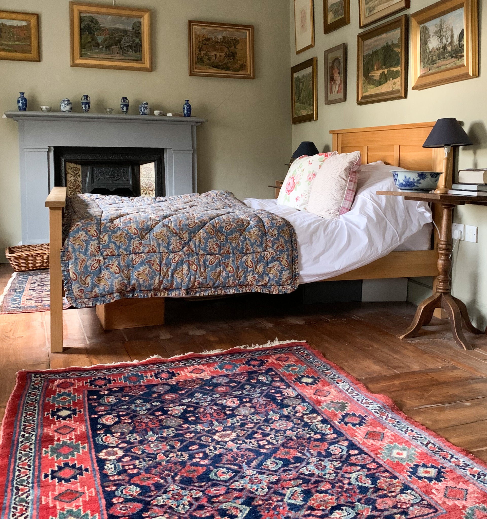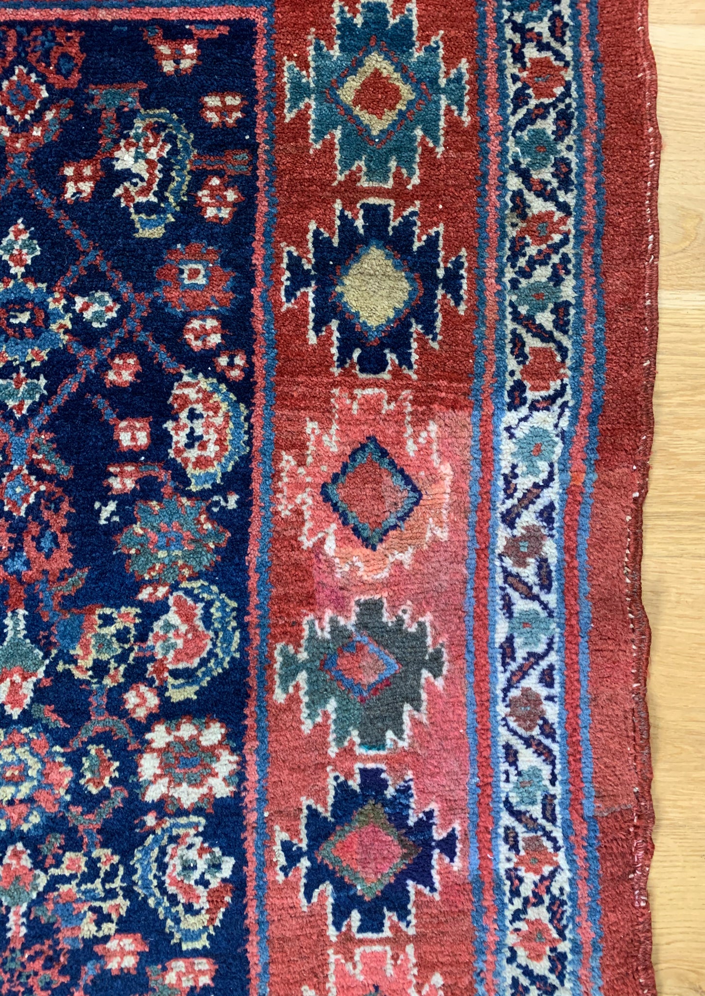 Herati patterns on the dark blue ground are surrounded by borders with hooked motifs. The colours include green, grey-green, pink, blue, red and a very pale yellow.