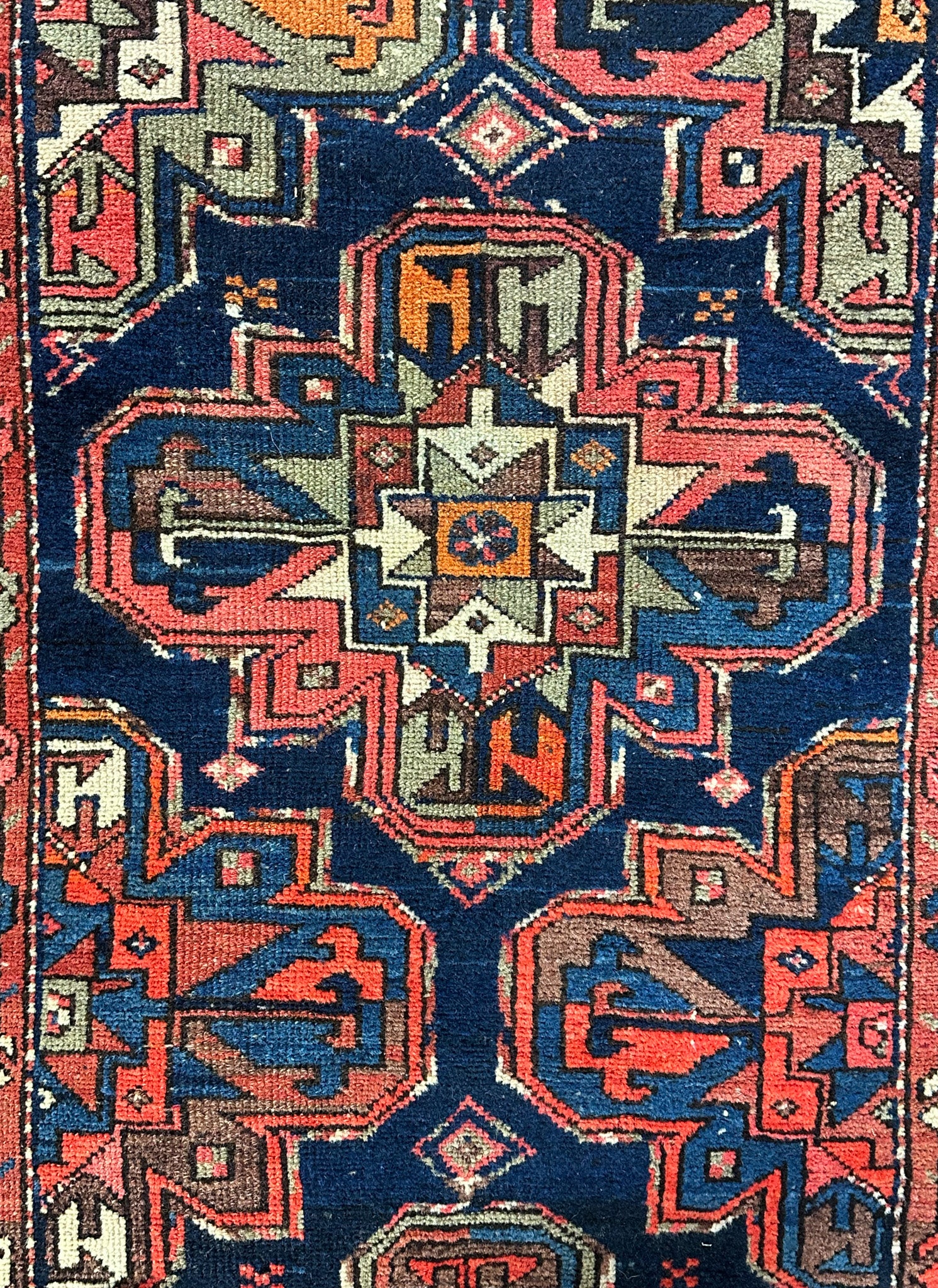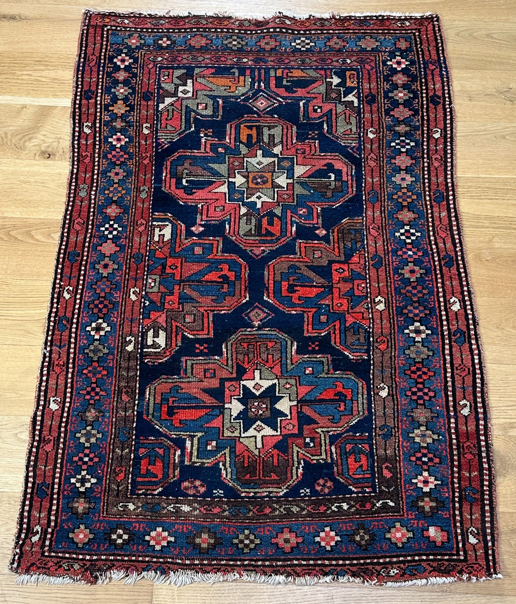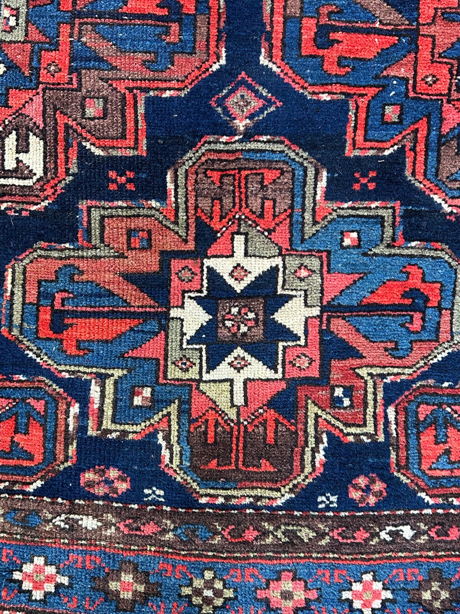 Dark blue field with two large lobed medallions and half medallions extending out of the field. Inner medallions with star centres, midblue main border of stepped medallions, red and brown boteh guards.
