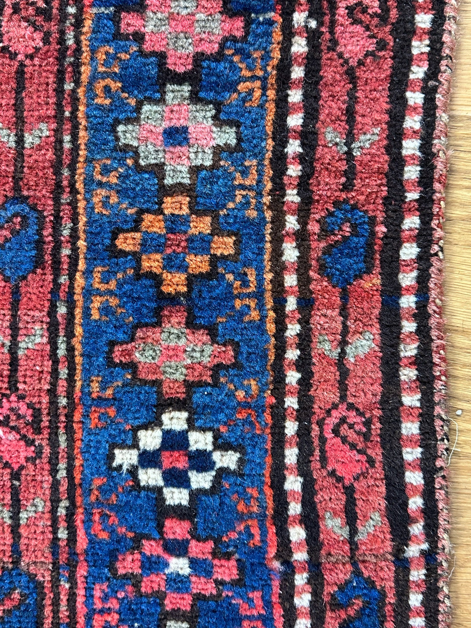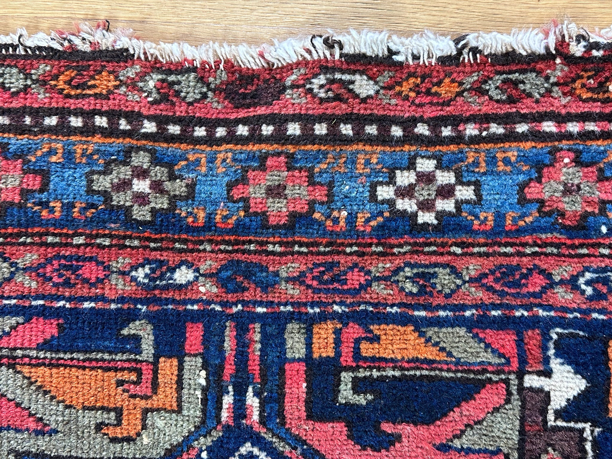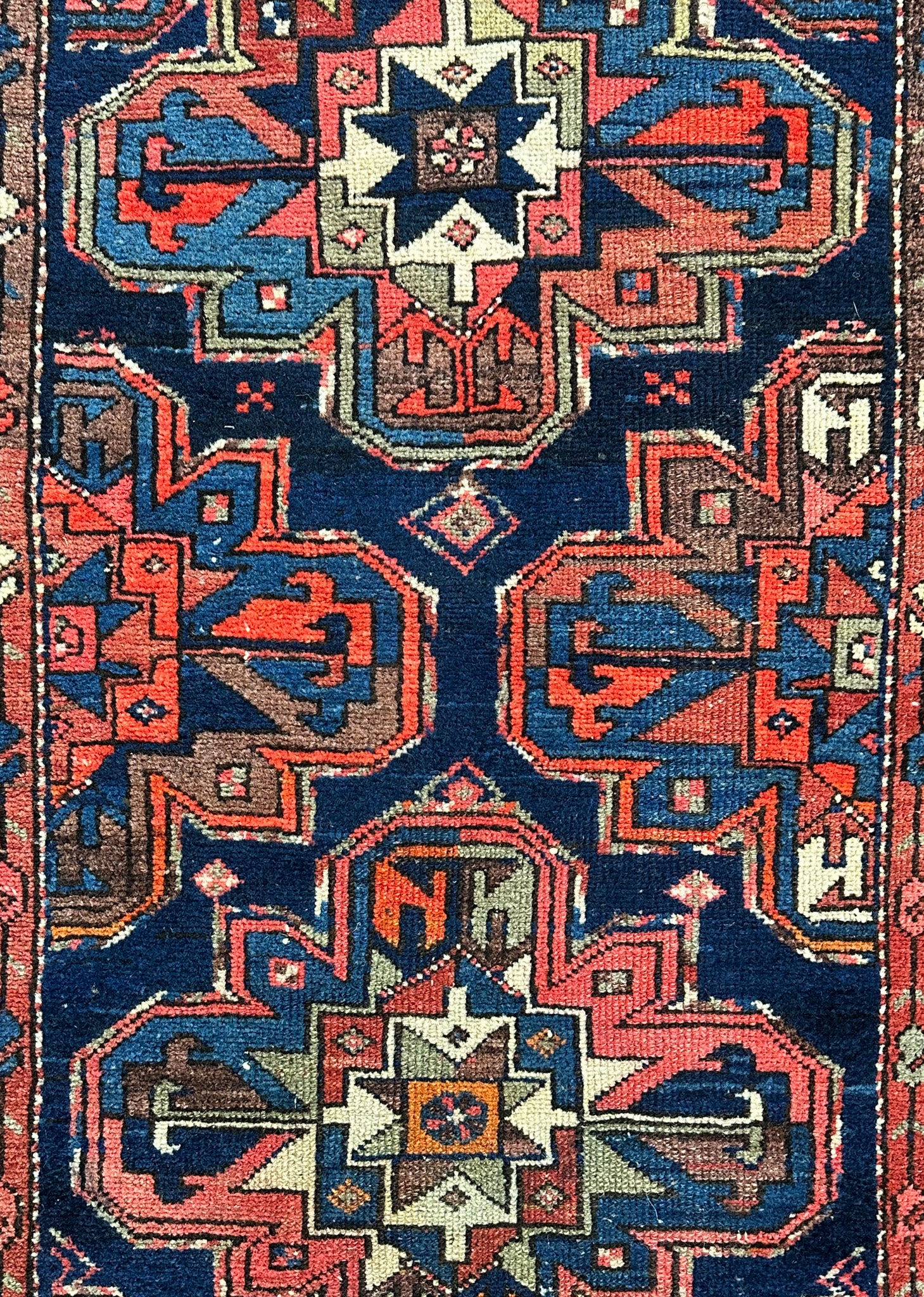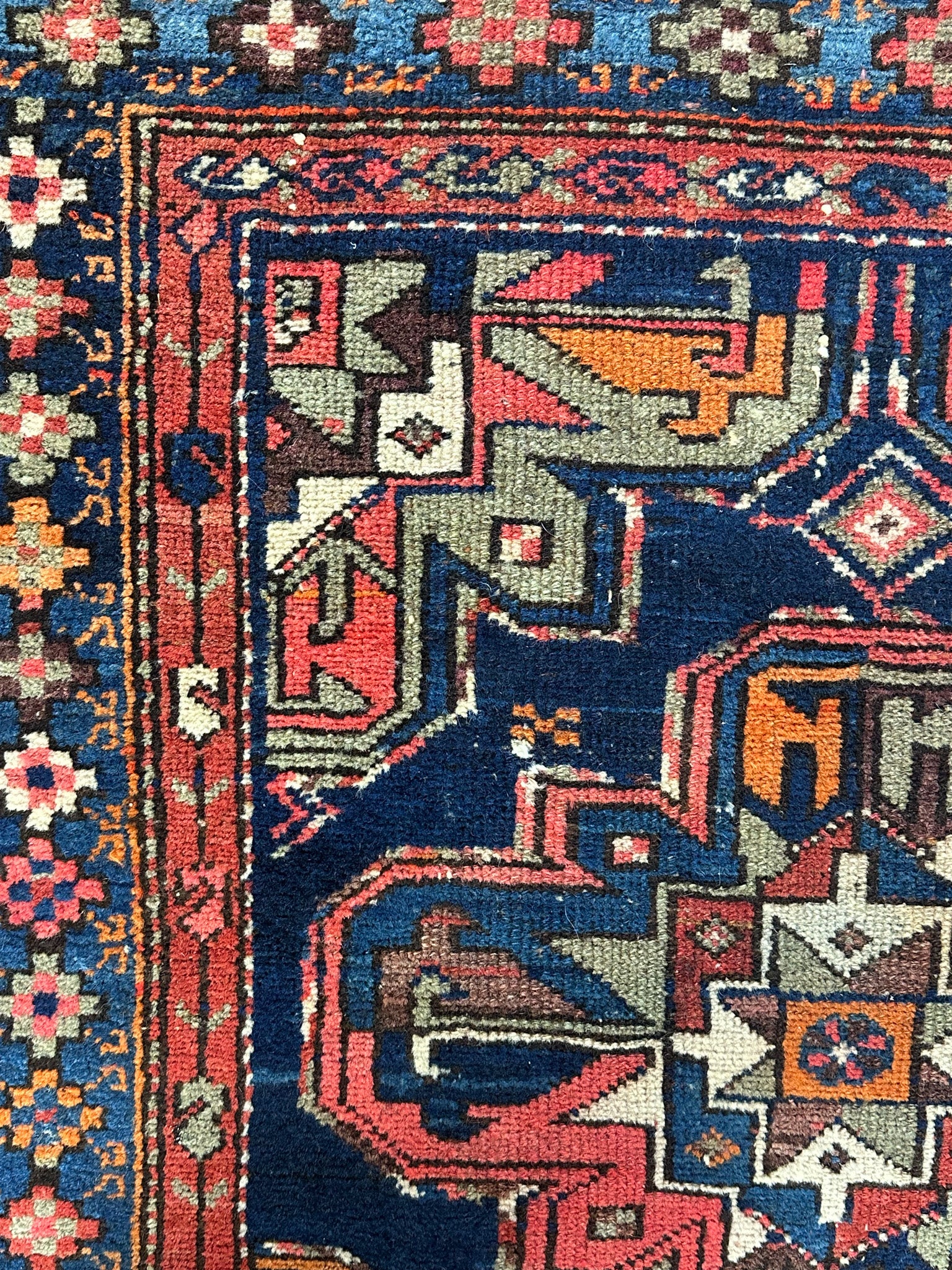 Dark blue field with two large lobed medallions and half medallions extending out of the field. Inner medallions with star centres, midblue main border of stepped medallions, red and brown boteh guards.